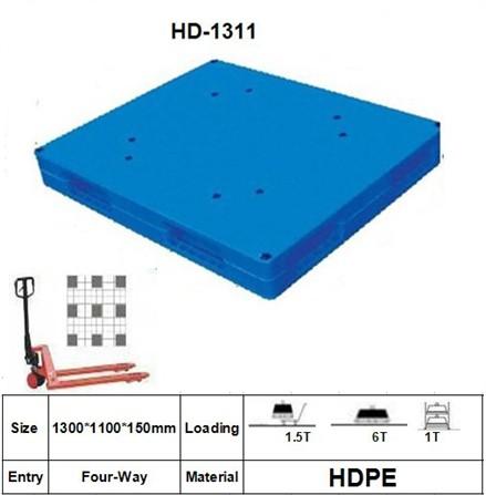 サイズ : 1300*1100*150mm エントリータイプ : 4 方向 スタイル : 両面 動的荷重 : 1.5t 静的荷重 : 6t 棚キャリング : 1t 材質 : HDPE または PP 両面プラスチックパレット。滑らかな表面。積み重ね可能。特徴: 1) 滑り止めゴムが挿入されています 2) プラスチックパレットの利点: 環境に優しく、耐久性、安全、リサイクル可能、衛生的、4方向エントリー、シロアリなし、メンテナンス不要 3) 競争力のある価格の高品質パレット 4) プラスチックパレットは木製パレットやスキッドの経済的な代替品です。 5) リサイクル可能で洗濯可能 6) 証明書: CE、SGS、ISO 9001、ISO 14001、OHSAS 18000 パレットについて: 1) さまざまなスタイルをお選びいただけます。 2) 幅広いサイズからお選びいただけます。 3) 色はカスタマイズすることができます。 4)新素材HDPE製。 5)ラックの持ち運びに適しています。